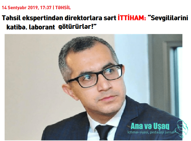 Bunlardan biri “Təhsil ekspertindən direktorlara sərt İTTİHAM: “Sevgililərini katibə, laborant götürürlər! “( Bax:https://m.modern.az/az/news/211542)” sərlövhəli yazıdır. Təhsil ekspertinin missiyası səmimi deyil, təhsilə belə xidmət etmirlər.