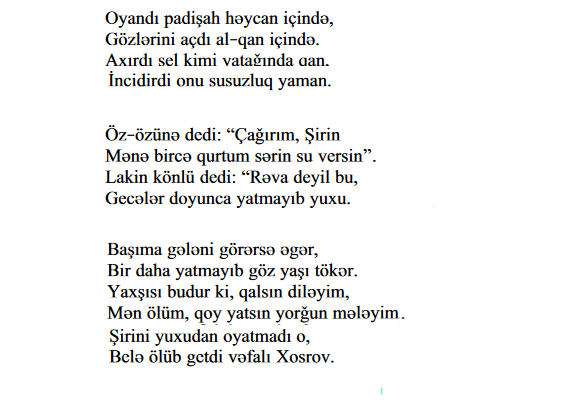 Fikir verin, əvvəldə qanına qəltan ediləndə Xosrov “Mən ölüm, qoy yatsın yorğun mələyim” deyən Şirini oyatmağa əli gəməmişdisə, Şirin də buna kövrəkliyi ilə insan varlığını yerindən oynadan bir əvəz qaytarmışdı.