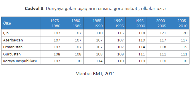 “Azərbaycanda diri doğulanların cins strukturunda 1990-cı illərin əvvəllərindən oğlan uşaqlarının artımı müşahidə olunur: “Hazırda hər 100 qız uşağına 114 -116 oğlan uşağı düşür. Cins nisbətinin pozulmasına görə Azərbaycan dünyada ikinci yerdə qərarlaşıb” (https://www.musavat.com/news/azerbaycanda-dogulan-her-100-qiza-114-oglan-usagi-dusur_766554.html) .