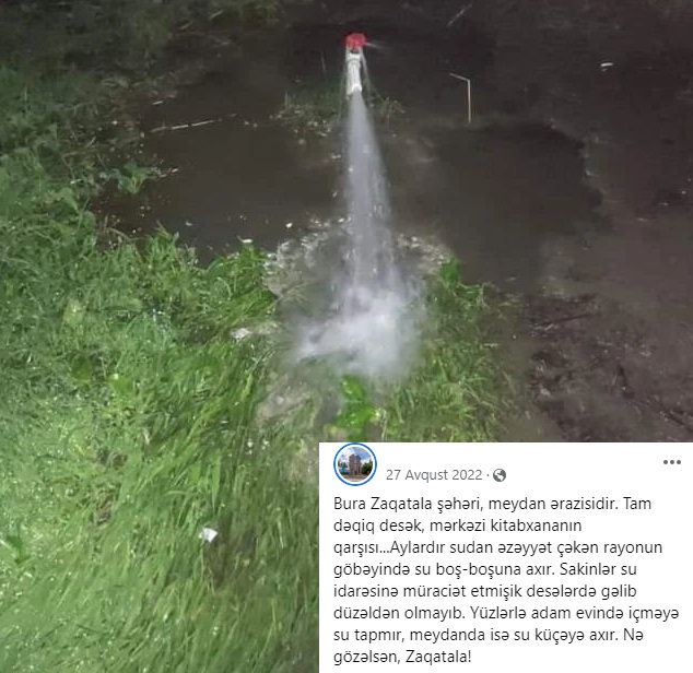 Nə qədər desəniz boş-boşuna axan su mənbələri var: yaşayış ərazilərində boş-boşuna axıb gedən şirin sulara rast gələcəksiniz. Şəxsi avtomobilini yuyan kim, xalça, palaz yuyan kim və sair.