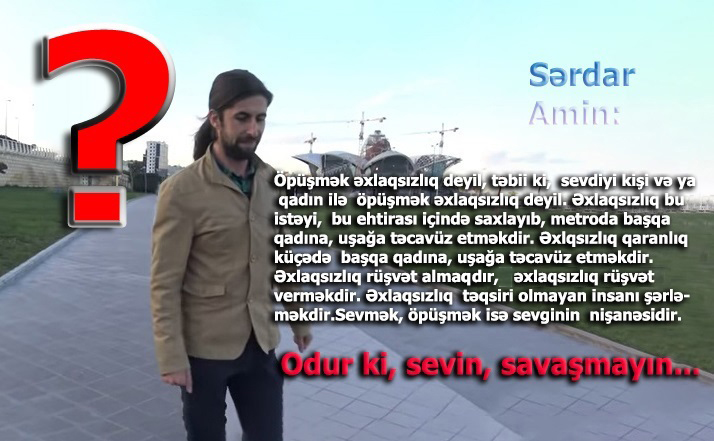 Bu cür mənzərələrlə hər kəs rastlaşır və hər zaman da söhbət mövzusudur. Hələ 4-5 il əvvəl www.a24.az kanalında yazıçı, jurnalist Sərdar Amin Yotube kanalı vasitəsilə Bakıda öpüşmək üçün münasib yerlərin olmaması haqqında bir süjet paylaşmışdı. Müəllif süjetdə öpüşən cütlükləri qınayanları qınayırdı. Deyirdi ki: “Öpüşmək əxlaqsızlıq deyil, təbii ki, sevdiyi kişi və ya qadın ilə öpüşmək əxlaqsızlıq deyil. Əxlaqsızlıq bu istəyi, bu ehtirası içində saxlayıb, metroda başqa qadına, uşağa təcavüz etməkdir. Əxlqsızlıq qaranlıq küçədə başqa qadına, uşağa təcavüz etməkdir. Əxlaqsızlıq rüşvət almaqsır, əxlaqsızlıq rüşvət verməkdir. Əxlaqsızlıq təqsiri olmayan insanı şərləməkdir. Sevmək, öpüşmək isə sevginin nişanəsidir. Odur ki, sevin, savaşmayın.”
