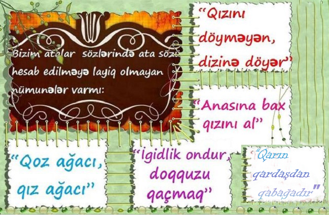 Doğru anlaşılmayan atallar sözlərimizin bir qısmi qadınlarımıza və qızlarımızla bağlıdır, məsələn: “Anasına bax, qızını al”, “Qızını döyməyən,dizini döyər”, “Analı qız özü böyüyər, anasız qızın sözü” və sair bu kimi atalar sözlərini misal göstərə bilərik. Görünür, belə fikirlər söyləyənlər atalar sözlərimizin məzmun və ieyalarını süzgün qavraya bilməyən çəxslərdir. Biz burada qməhkəmə iclaşı keçirmirik ki. Həmin qızlar, qadınlar düşmən deyillər ki. Hamısı sənin, mənim, bizim doğmaların əzizləridir. Burada eyham ola bilər, amma aşağılamaq , kişini qadınların fövqünə qaldırmaq ağıla da gəlməməlidir. 1-ci atalar sözünün məzmunu budur ki, oğluna ömür yoldaşı, özünə gəlin axtaran analar qızları mükəmməl tanıya bilməzlər axı. Ola bilər ki, heç görməsinlər də. Çünki dədə-babaların vaxtında qız uşaqlarının çöldə-bayırda görünməsi yaxşı qəbul edilməzdi. Amma tərəflərin valideynləri bir-birlərini tanıyardılar. Gəlin həstətində olan valideynlərin məntiqi də belə olardı ki, ana necədirsə, qızı da elə olacaq və yaxud qızını ərə verəcək ailə də düşünərdi ki, atası necədirsə, oğlu d elə arvad saxlayacaq.