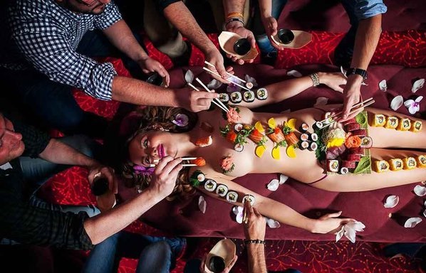 Məsələn, əsrlərdir ki, Cənubi Asiyada elit təbəqədən olan insanlar üçün servis edilən “çılpaq qadın üzərində suşi yemək” təqdimatı keçirirlər. Bu təqdimat “nyotaimori” adlanır, yəni, “qadın bədəninin təqdimatı”.