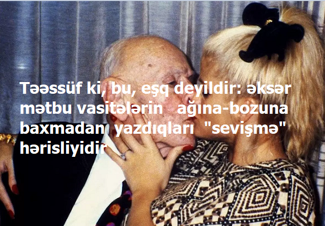 Məsələn, saytların birində oxumuşam ki, Türkiyədə 71 yaşlı Xalis Topraq özündən 54 yaş kiçik Nazlıcan Tağızadə ilə evlənib. 71 yaş hara, 17 yaş hara..?! Sonra kütləvi informasiya vasitələrində bu uyğunsuz cütlüklərin məhkəmə çəkişmələri, miras davaları haqqında yazılar dediklərimzin məntiqi davamıdır.