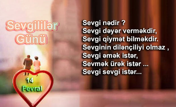 Bu gün Sevgililər Günüdür. Bizim Milli Sevgililər günü olmasa da, sevənləri təbrik etməyə dəyər, hər kəsə devgi arzulamağa dəyər. Kaş insanların bir günü deyil, hərgünü Sevgi günü olsun. Dünyaya sevgi arzulayırıq. Bütün gənclərimiz sevgilərinə, sevdiklərinə qovuşsun.