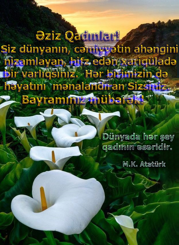 Bu gün Azərbaycan qadınları bayram əhvali-ruhiyyəsindədirlər. Bu gün dünyamızın bəzəyi, şərəfi olan olan analarımızın, baçılarımızın bayramıdır. Ümummilli liderimiz Heydər Əliyevin qadınlarımız haqqında iftixarla dediyi sözlər onların halal haqlarıdır: “Mən dünyanın çox yerlərini gəzmişəm, qadınlarını görmüşəm. Fikrim belədir ki, Azərbaycan qadını bütün dünyadakı qadınlardan gözəldir.”