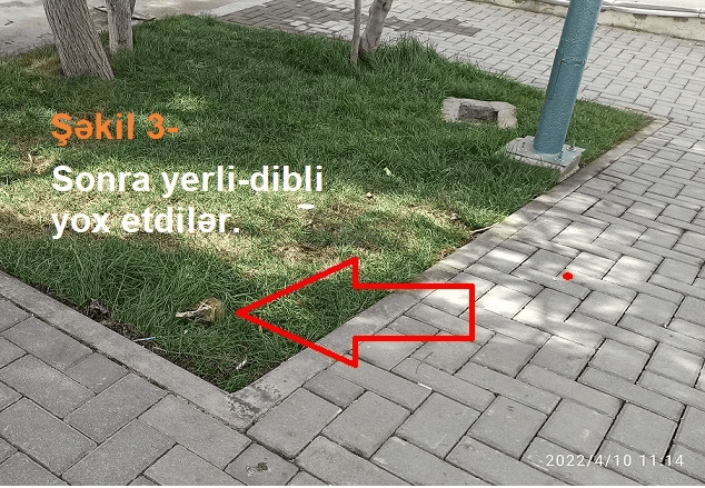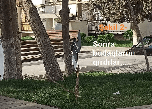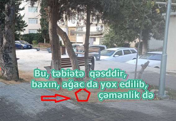 Onu da qeyd edək ki, yolun binanın həyət tərəfində olan hissəsində də vəziyyət ürək açan deyil. Bir neşə il əvvəl cəngəlliyi xatırladan ərazini keyfiyyətli şəkildə etməsələr də, normal hal gətirmişdilər, sakinlər gec də olsa, bir yaşıl mühit qazanmışdılar. Amma bir il keçməmiş yenə geriyə doğru yönəldik. Daha çox asosial hərəkətləri yniyetmə və gənclər törədir.dağıdır. Bir adamın tükü tərpənmir. Nə bələdiyyələr, nə Mənzil İstismar sahəsi, nə polis şöbəsinin aidfiyyəti qurumlar bu yöndə bir addım atmırlar. Belə davam edərsə, uzağı bir ilə bu yerlər 3 il əvvəlki vəziyyətinə qayıdacaq.