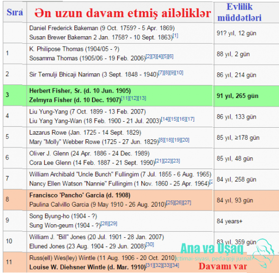 Müasir tarixdə ən uzun nikah Amerika Birləşmiş Ştatlarından olan Herbert Fisher və Zelmyra Fisher cütlüyünə nəsib olub. 27 fevral 2011-ci ildə Herbert 105 yaşında vəfat edəndə onların evlilk tarixi 86 il 290 gün davam etmişdir. Zelmyra isə iki ildən sonra 105 yaşında dünyasını dəyişəcəkdi.
