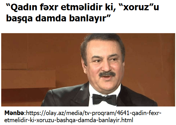 Xatırlayırsınızsa, Əməkdar artist Cavanşir Məmmədov 2 il bundan əvvəl “MTV Maqazin” verilişlərinin birində dedi ki, qadın fəxr etməlidir ki, “xoruz”u başqa damda banlayır. Onda kişi də fəxr etməlidir ki, qadın ən qoxulu ətri üstünə səpələyib metroda, avtobusa, hansısa ziyafətdə, tədbirdə yad kişinin bərabərində əyləşir, ona rayihə saçır? Belə etik görüşləri olan Əməkdar artistləri nə canfəşanlıqdır ekranlardan, manşetlərdən düşməyə qoymurlar. Belə verilişlər sevgi, ailə dəyərlərini sarsıdır, həyat haqqında hələ yetkin fikirləri olmayan gəncləri assosial davranışlara sürükləyir. Onların beyinlərindəki duyğularla bağlı limbik sistem cinsi həyəcan və cinsi istəklə bağlı funksiyaları fəallaşdırır.