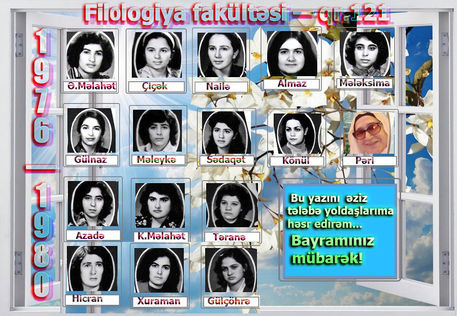 Fransız yazıçısı Emil Zolyanın məşhur sözləri var: “Heç bir bəzək və ya makiyaj qadını analıq sevgisi qədər gözəl edə bilməz”. Ona görə də ana olmağa can atır qızlarımız. Elə onların bundan sonrakı varlıqları sa Ana olmaqla sonuclanır, bütövləşir, müqəddəsləşir. Elə hər bir Azərbaycan proletarını dünyanın bütün proletarları arasında daha qürurlu edən də Azərbaycan Qadınlarıdır, Azərbaycan Analarıdır. Elə bu təslimiyyətdə Qadınlar Günündə Anaveushaq.wordpress.com-un yaradıcı heyəti adından çoxdan ailə həyatı qurmuş, indi isə hamısı nənə olmuş 121-ci qrupun qızlarının şəxsində ailə həyatı qurmağa hazırlaşan bütün qızlarımıza Allahın dərgahına əl uzadıb dua etdiyimiz diləkdir ANA olmaq.….