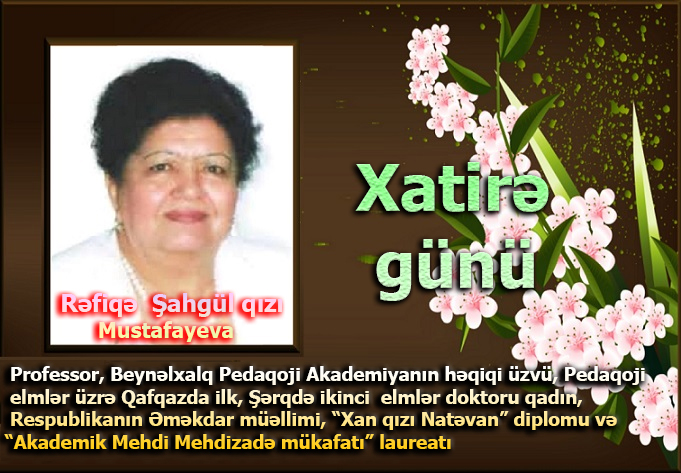 2019 — Professor, Beynəlxalq Pedaqoji Akademiyanın həqiqi üzvü, Pedaqoji elmlər üzrə Qafqazda ilk, Şərqdə ikinci qadın elmlər doktoru, Respublikanın Əməkdar müəllimi, “Xan qızı Natəvan” diplomu və “Akademik Mehdi Mehdizadə mükafatı” laureatı Rəfiqə Şahgül qızı Mustafayeva 83 yaşındea vəfat etmişdir.