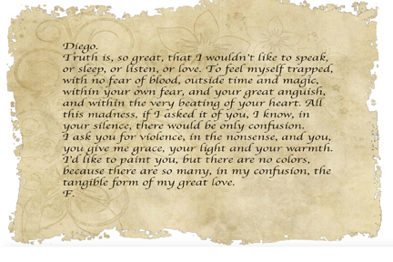 Kahlonun Riveraya yazdığı sevgi məktubları, “Frida Kahlonun Gündəliyi: İntim Avtoportret”də (ictimai kitabxana) tapılmış və iyirmi yeddi illik münasibətləri boyunca uzanan, ikisinin paylaşdığı dərin və davamlı əlaqəni, bütün məhəbbətin dolu olduğu duyğu qazanı ilə dolu olan coşğun bir əlaqəni göstərir: sevinc, əzab, sədaqət, arzu, həsrət, sevinc. Nəfəssiz intensivliklərində, onlar Corciya O’Kif və Alfred Stieglitz, Anais Nin və Henri Miller, eləcə də Virciniya Vulf və Vita Sakvil-Uest arasında yazılan sevgi məktubları ilə eyni stratosferdə uçurlar.