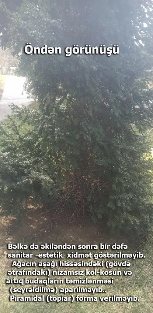 Cənab İlham Əliyevin əkdiyi ağacın gövdəsindəki “kol-kos” təmizlənməli, əvəzinə rəngli dekorativ qırıntı daşlar (mulyaj) və ya həmişəyaşıl alçaqboylu örtücü bitkilər əkilməlidir. Bu, ağacı kompozisiyanın mərkəzinə gətirər.