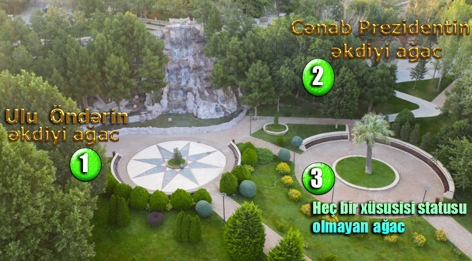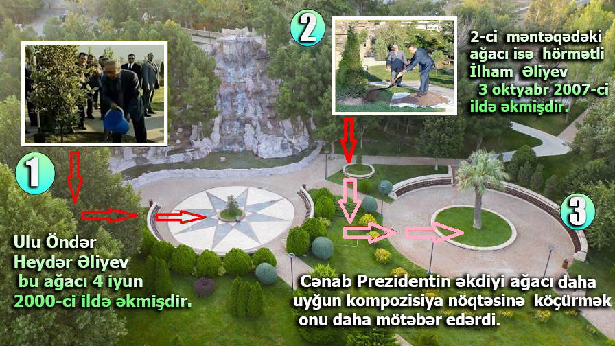 Bəzən böyük həqiqətlər çox kiçik görünən detallarda gizlənir. Heydər Əliyev adına Parkdakı şəlalənin qarşısında diqqətimi çəkən iki ağac da belə detallardandır. Bu ağaclardan birini 4 iyun 2000-ci ildə Azərbaycanın həmin dövrdə prezidenti olmuş Heydər Əliyev əkmişdir: bu park da məhz Ulu Öndərin adını daşıyır. İkinci ağacı isə indiki prezidentimiz cənab İlham Əliyev 30 oktyabr 2007-ci ildə əkmişdir.